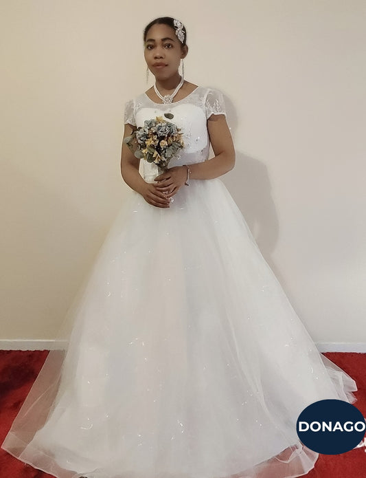 Robe de mariée, manches courtes à bretelles, blanche ( à louer)